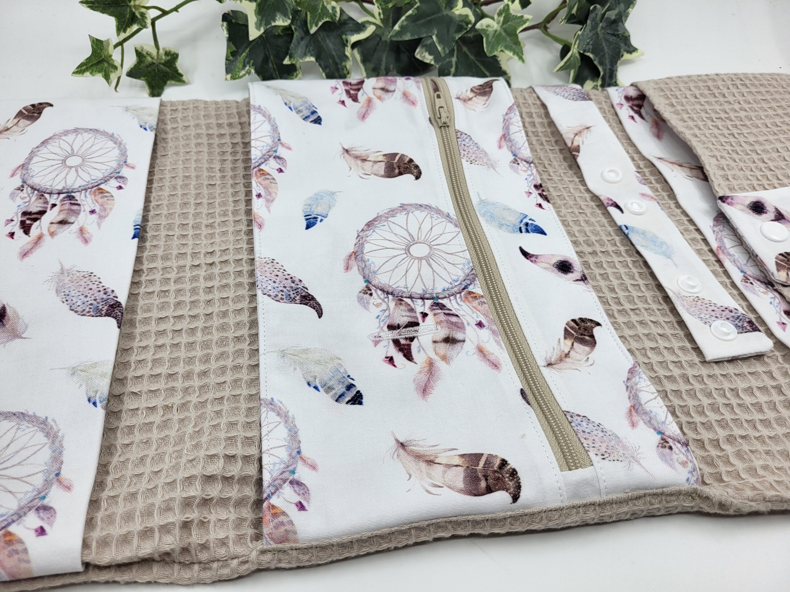 Ein schönes und sehr praktisches Windeletui für Unterwegs mit Platz für mehrere Windeln (auch verschiedene Grössen), Feuchttücher, Wickelauflage und ein paar Kleinigkeiten wie Cremen, Windelsäcklis etc.